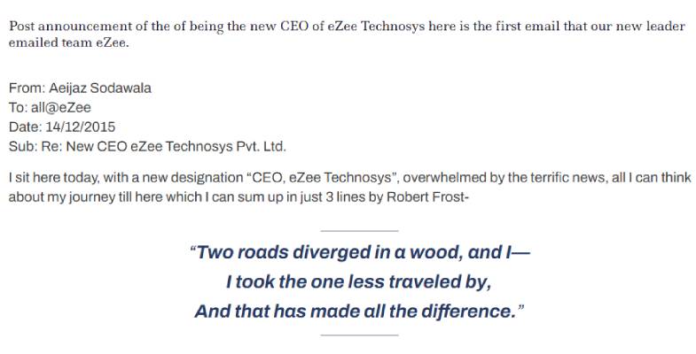 Post announcement of the of being the new CEO of eZee Technosys here is the first email that our new leader emailed team eZee.